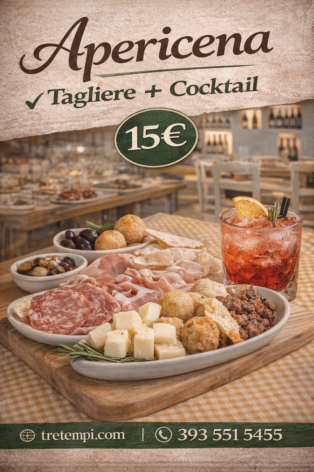 Un apericena non è completo senza qualcosa da condividere. Il Tagliere Tre Tempi è la nostra proposta speciale: un mix di sapori autentici che accompagna alla perfezione i cocktail della casa.